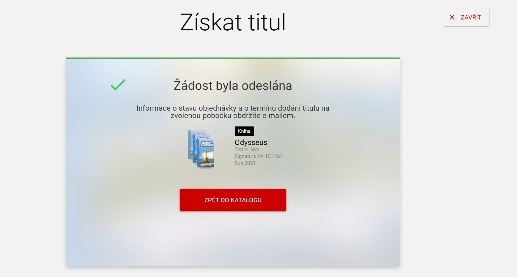 Poté, co projdete průvodce zadáním objednávky, zobrazí se potvrzení o úspěšném vytvoření objednávky povinného výtisku. Okno zavřete tlačítkem „ZAVŘÍT“ v pravém horním rohu nebo kliknutím na tlačítko “ZPĚT DO KATALOGU”.