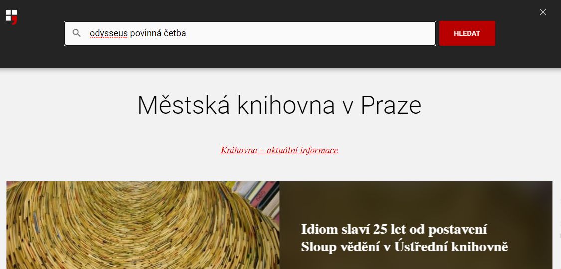Knihu, kterou si chcete objednat ke studiu, nejprve vyhledejte v katalogu. V pravém horním rohu kliknete na velké červené tlačítko s názvem „HLEDAT“. Otevře se vyhledávací pole, do kterého napište požadavek: název knihy, jméno autora, případně jakékoli další vodítko, které máte k dispozici. Kliknete opět na „HLEDAT“.