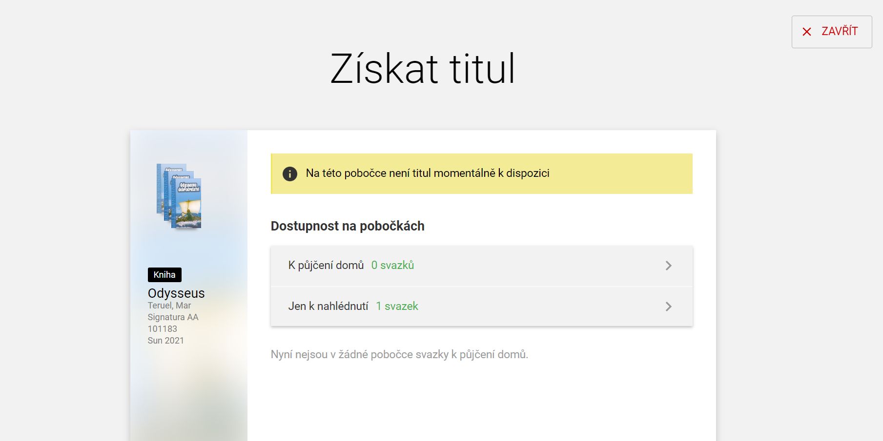 Zobrazí se okno s názvem „Získat titul“. Zde uvidíte tzv. „Dostupnost na pobočkách“ s informací, v jakém režimu se lze ke knize dostat. Standardně zde můžete knihu rezervovat (stav “K půjčení domů”). Jedná-li se o povinný výtisk dostupný ke studiu v knihovně, je zde stav “Jen k nahlédnutí”. OBR 3