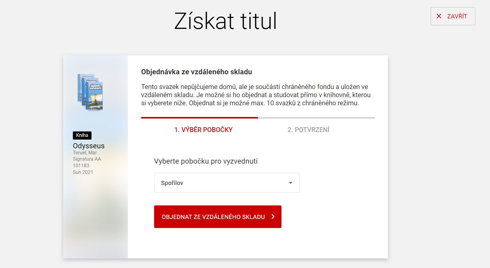 Pokud si chcete knihu objednat do studovny, klikněte na řádek “Jen k nahlédnutí”. Zobrazí se okno “Objednávka ze vzdáleného skladu”, kde si vyberte pobočku pro vyzvednutí a klikněte na tlačítko “OBJEDNAT ZE VZDÁLENÉHO SKLADU”.