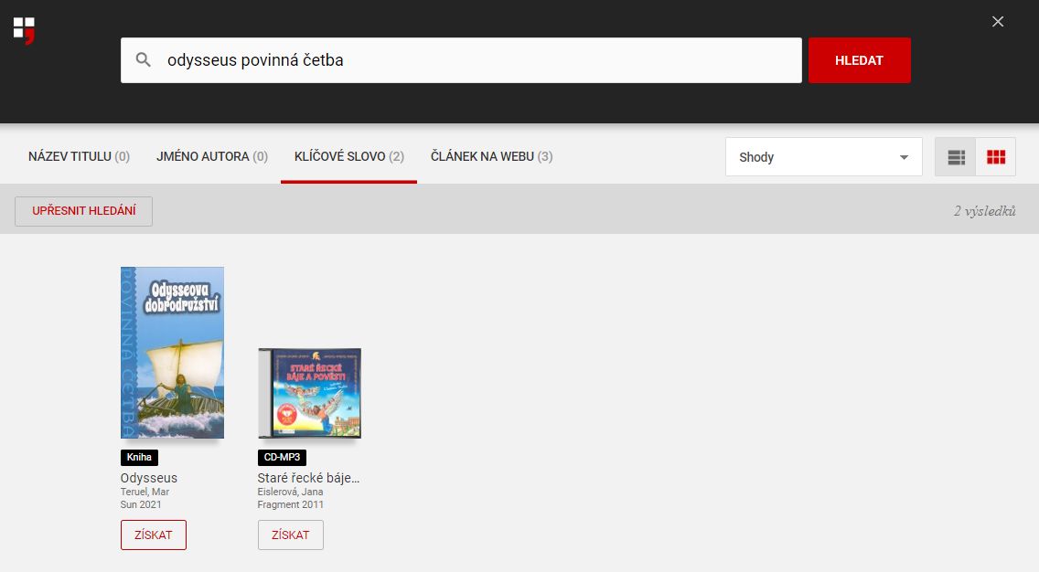 Vytvoří se výpis výsledků, kde pod obálkou knihy, která vás zajímá, kliknete na tlačítko „ZÍSKAT“.