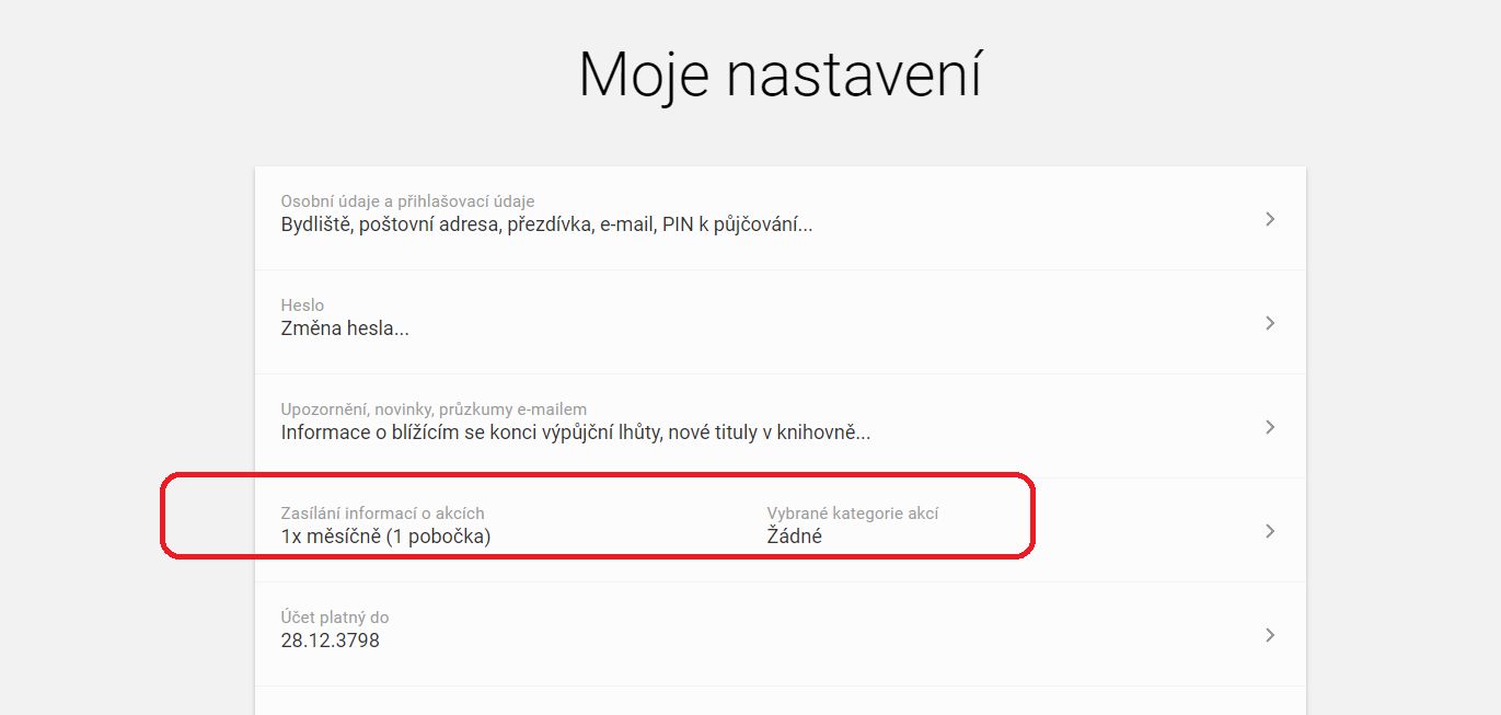Na stránce “Můj účet” klikněte na tlačítko „NASTAVENÍ“ v pravém horním rohu. Klikněte na sekci „Zasílání informací o akcích“. Dostanete se na stránku „Nastavení upozornění na akce v knihovně“.