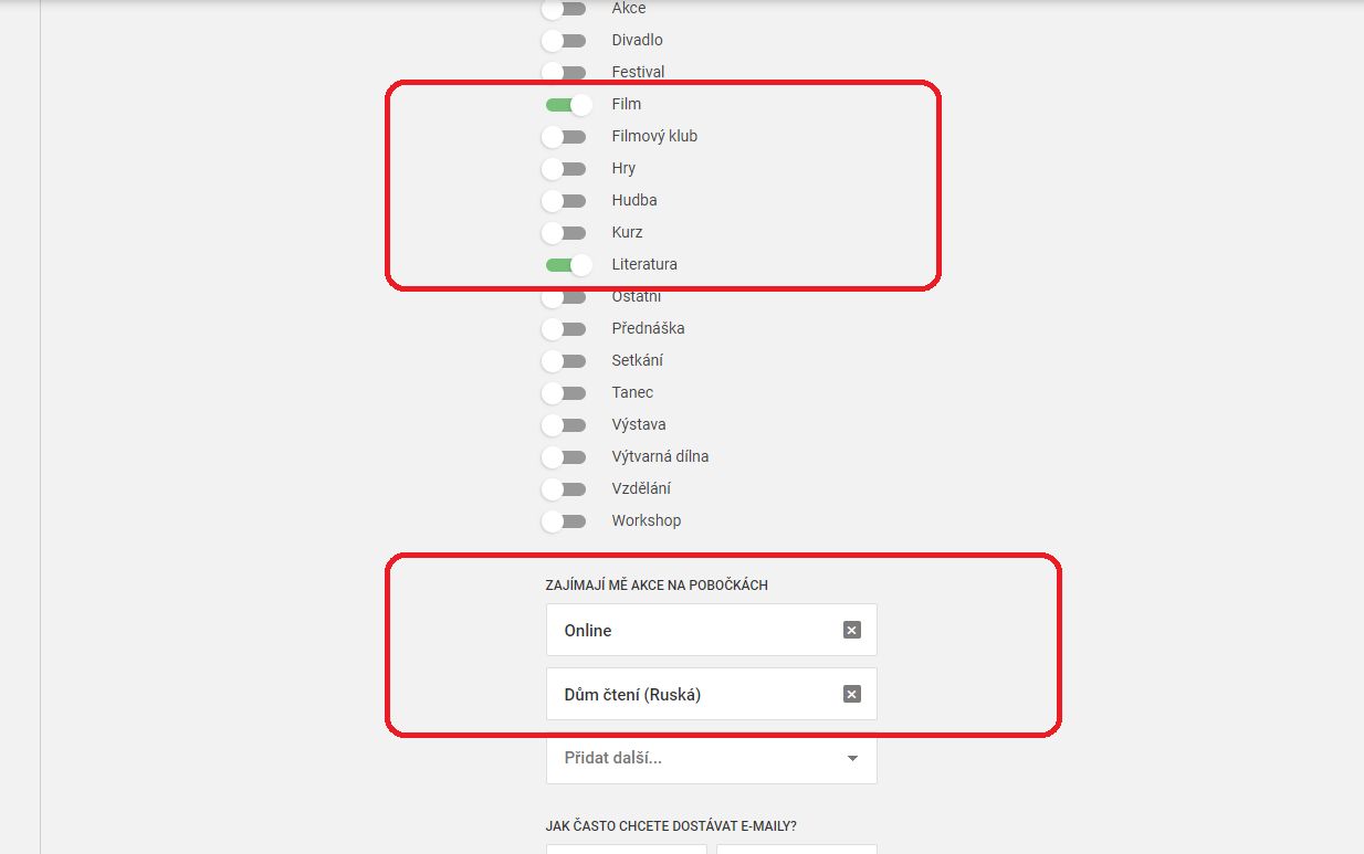 Zde si můžete nastavit typy akcí, o jejichž konání chcete být informováni. Dále můžete zvolit pobočku, která vás zajímá. Jako poslední si vyberete, jak často vám tyto pozvánky mají být zasílány. Můžete si vybrat buď 1× týdně, nebo 1× měsíčně.