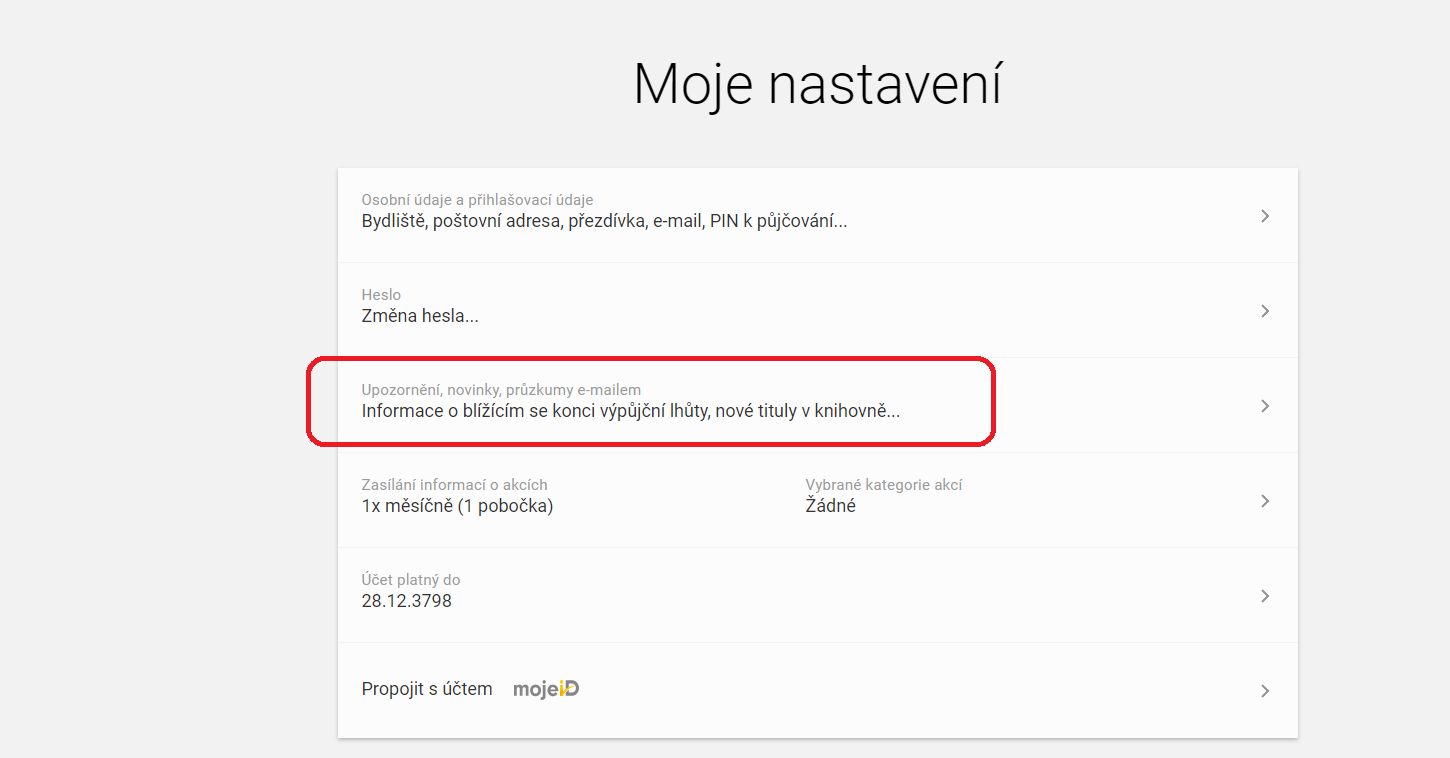 Na stránce „Můj účet“ klikněte na V pravém horním rohu najdete tlačítko „NASTAVENÍ“ v pravém horním rohu. Klikněte na sekci „Upozornění, novinky, průzkumy e-mailem“. Dostanete se na stránku „Nastavení zpráv z knihovny“.